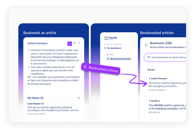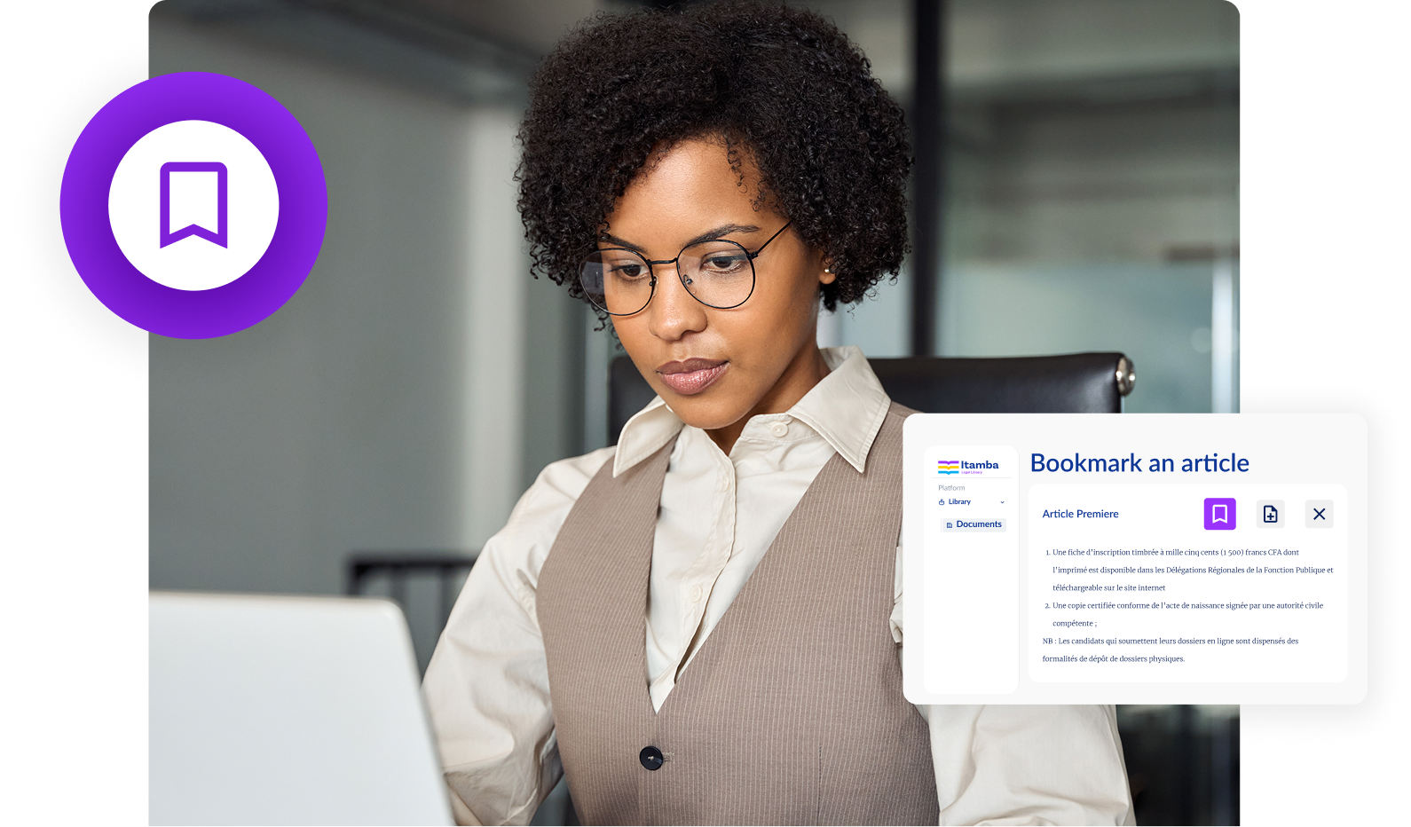 You can keep the legal texts that interest you by saving them in your bookmarks and notes. Thanks to the Itamba Legal mobile application, you can now take the library, your notes, and bookmarks with you everywhere and consult them 24/7, without an internet connection.